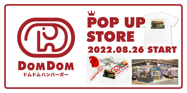 2022年8月26日(金)より、東京都町田市 南町田グランベリーパークセントラルコート1階(キッズディスカバリー)、玩具専門店「博品館トイズコンセプト」内に期間限定ドムドムハンバーガーPOP UP STOREが開催され、ドムドムハンバーガーのロゴやアイコンである『どむぞうくん』をあしらった各種アイテムや、1970年町田市にドムドムハンバーガーの1号店があったという縁からレトロ店舗デザインを施した新Tシャツやキーホルダー、ステッカーなどの新アイテムも販売いたします。