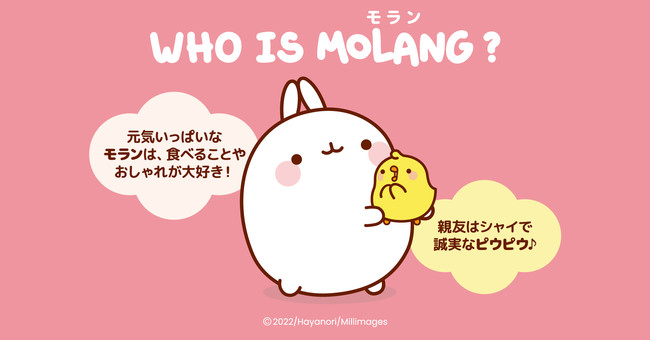 『MOLANG(モラン)』は、2010年に韓国のイラストレーターHye-Ji Yoon(ユン・ヘジ)の落書きから誕生しました。2015年にグローバルな権利を獲得したフランスのアニメーションスタジオMillimages (ミリマージュ)は、作家でありクリエイターでもあるMarie-Caroline Villand(マリー-キャロライン ヴィランド)と、300話以上の『MOLANG』のTVシリーズを制作し、190の国と地域で配信されました。