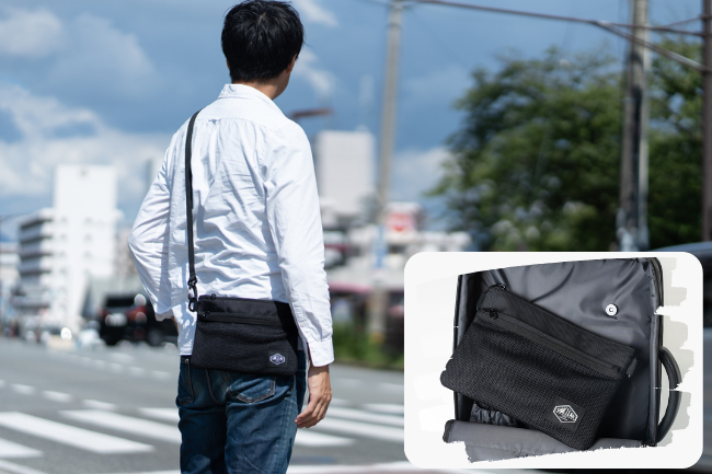 出張やビジネスシーンでは、貴重品の手元管理にも役立つ2in1仕様