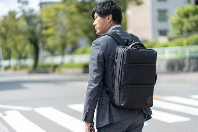 本革仕様の持ち手がしっかりと手に馴染み、背面のリュックショルダーが完全に収納できるため、ビジネスシーンに必要な縦持ちstyle、横持ちstyleもスマートに決まります。