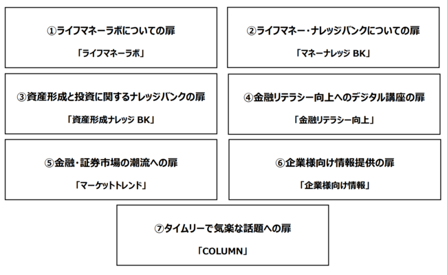 情報発信サイト「LIFE MONEY LAB.」には以下の7つの「扉」からそれぞれの情報にアクセス可能です。