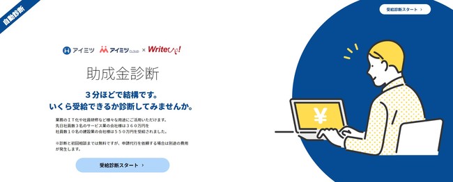 「アイミツ助成金診断」(https://shindan.jmatch.jp/writeup/?unilabo)は、サイト上にある数問の設問に答えるだけで、自社がどれくらいの助成金を受けられるかを把握できるほか、助成金に関する相談をライトアップへ行えるサービスです。また、助成金・補助金申請の目的となる業務の委託先に関する相談も「アイミツ」へ行えます。いずれのサービスも「アイミツ」ユーザーは、無料で利用できます(※)。