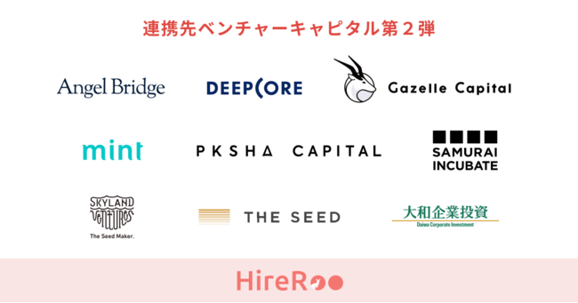 Angel Bridge、DEEPCORE、Gazelle Capital、mint、PKSHA CAPITAL、サムライインキュベート、Skyland Ventures、THE SEED、大和企業投資
