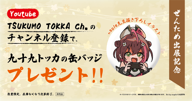 アウリン所属のバーチャル販売員「九十九トッカ」のYoutobeチャンネル [TSUKUMO TOKKA Ch.]を登録いただいた方に、イラストレーターmapleさん描き下ろしの「九十九トッカ」イラストの特製缶バッジをプレゼントいたします!