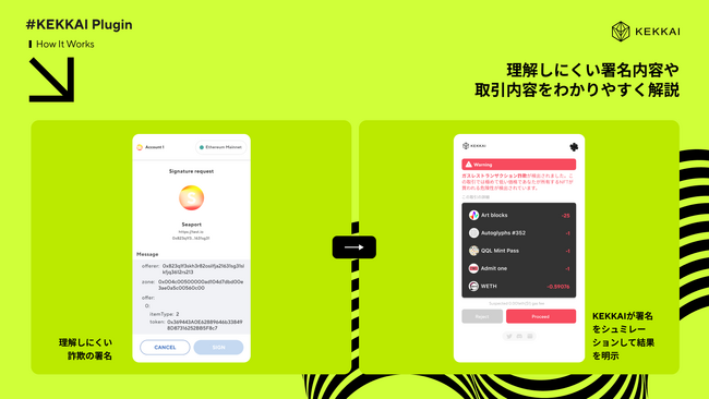 Metamask等のウォレットがトランザクションを実行する前に、KEKKAIがシステム内で取引をシミュレートし、結果を明示します。詐欺被害の多くは気づかず詐欺取引を自分から実行してしまったというケースであり、それに対してKEKKAIでは危険な操作やコントラクトが検出された時には警告が表示されます。