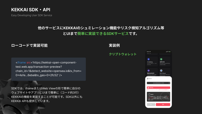 KEKKAIに実装されている「トランザクションをシミュレーションする機能」と「詐欺取引を検知する機能」をパッケージング化したSDK・APIサービスを展開しています。