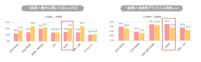 特に、初産婦の“経済面”に対する不安は「具体的アドバイスが欲しい」という項目で最も高いのに対して、経産婦の場合「誰かに聞いて欲しいだけ」という項目で高いポイントとなりました。