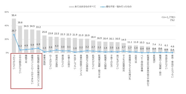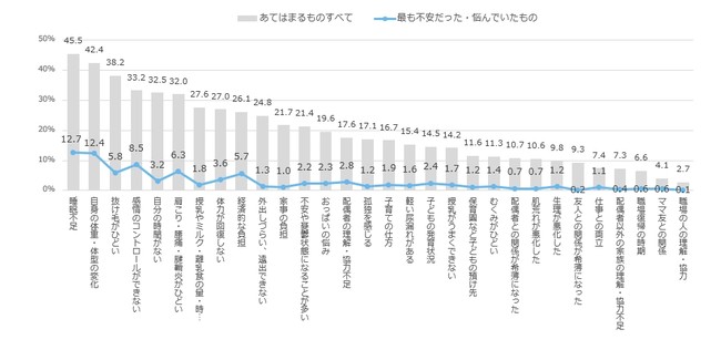 また、産後の悩みとしては「睡眠不足」が最も高く、「自身の体重・体型の変化」「抜け毛がひどい」といった、身体面に関する悩みが高くなりました。