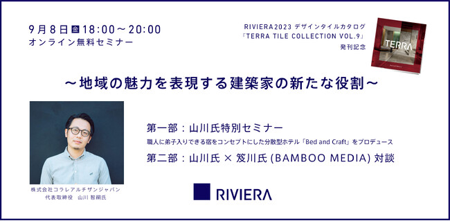 建築用タイル・石材の輸入販売商社であるリビエラ株式会社(本社:静岡県静岡市、社長:加藤久和)は、新カタログ「RIVIERA 2023 デザインタイルカタログTERRA TILE COLLECTION VOL.9」の発刊記念として、2023年9月8日(金)18:00〜20:00に、無料Webセミナー「地域の魅力を表現する建築家の新たな役割」を開催いたします。