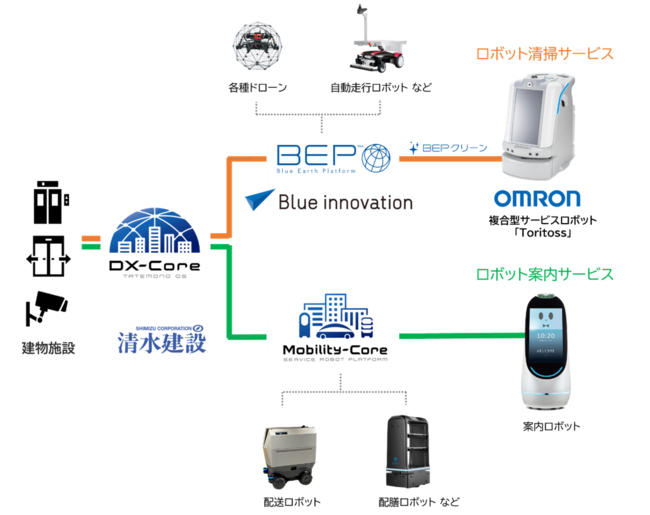 建物OS「DX-Core」を核に「ロボット清掃サービス」「ロボット案内サービス」を展開、自動運転車の社会実装を見据えた建物施設・モビリティ・ロボットの連携基盤の構築へ