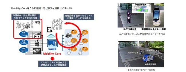清水建設が構築する「Mobility-Core」は、施設・街区と自動運転車両・ロボット間の連携基盤として研究開発を進めてきた自動運転プラットフォームを利用し、建物設備と各種サービスロボット・自動運転車を統合制御するシステムです。施設側の自動運転管制・監視システム、エレベーター等の建物設備と、施設内で稼働する車両・ロボットを連携させるための基盤として機能します。この基盤を活用することで、自律型モビリティの開発メーカーやサービス事業者が他社のモビリティや建物設備との連携機能を独自に開発する必要がなくなり、複数のモビリティを組み合わせた施設サービスを容易に展開できるようになります。