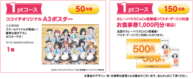 「A3ポスター」、「カレーハウスCoCo壱番屋/パスタ・デ・ココ共通お食事券1,000円分(税込)」が抽選で当たります。