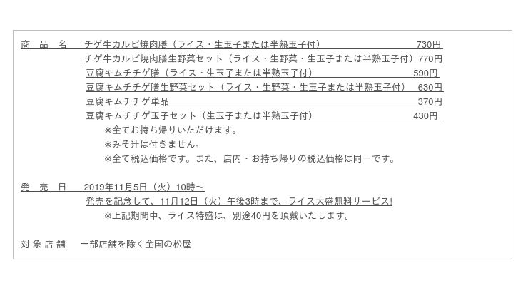 このたび松屋フーズ(本社:東京都武蔵野市、代表取締役社長:瓦葺一利)では、牛めし・カレー・定食・その他丼の「松屋」におきまして、2019年11月5日(火)10時より『チゲ牛カルビ焼肉膳』「豆腐キムチチゲ膳」を新発売いたします。