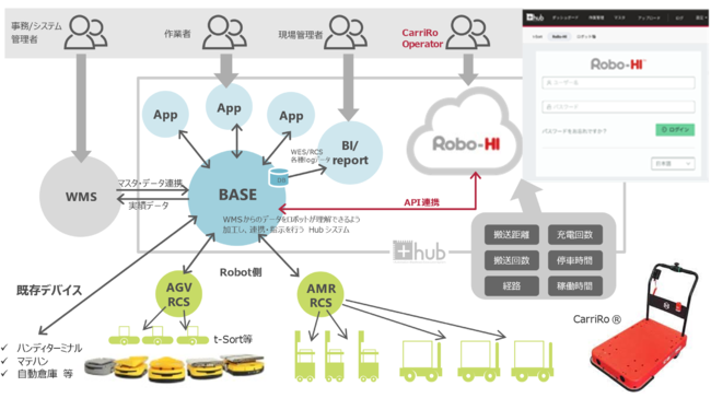 CarriRo(R)の複数台制御や遠隔操作、運用の可視化を実現させ、さらなる省人化の効果をあげることを目的としたZMP独自開発システムです。外部連携APIを通じてあらゆるシステムやロボット、デバイスと接続する事も可能です。「+Hub」と連携する事で、より効率的になり、シームレスな自動化を実現します。