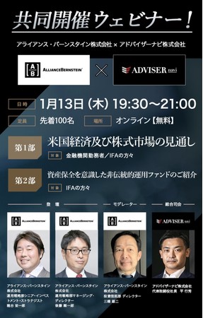 IFA総合コンサルティングファーム『アドバイザーナビ』主催、『アライアンス・バーンスタイン』協力によるIFA/金融機関勤務者向けウェビナーが2022年1月13日(木)19:30〜開催決定!!