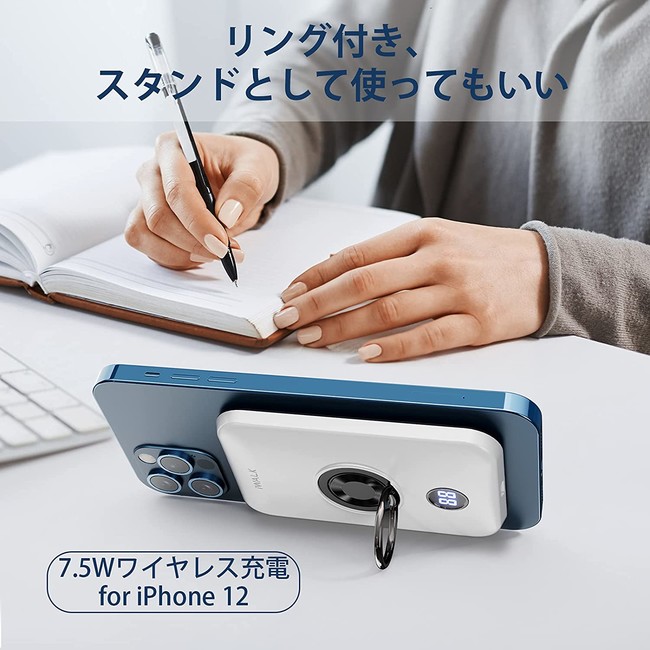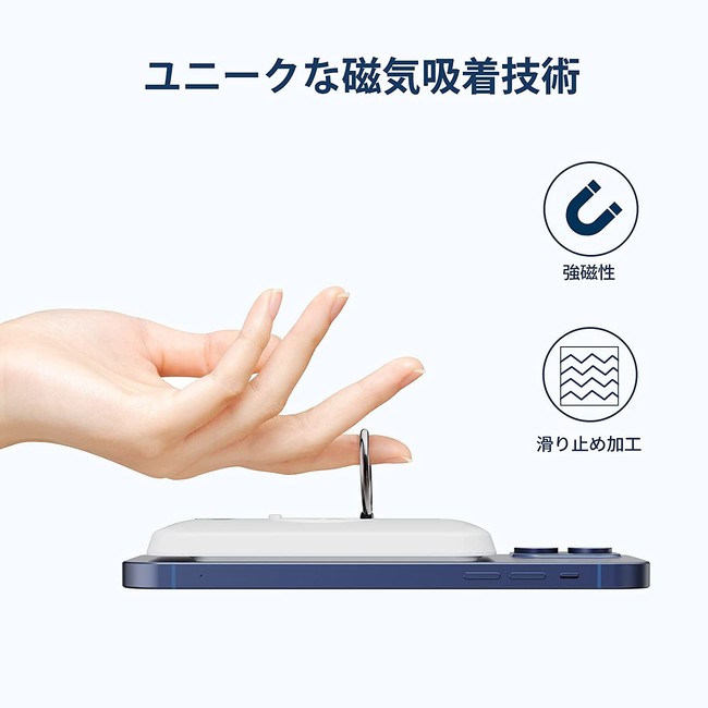 マグネット吸着なのでコードレス&コンパクトなモバイルバッテリー。リング付きなので操作性が高く、スタンドとしても使えます。MagSafe対応モデル。