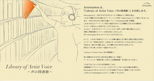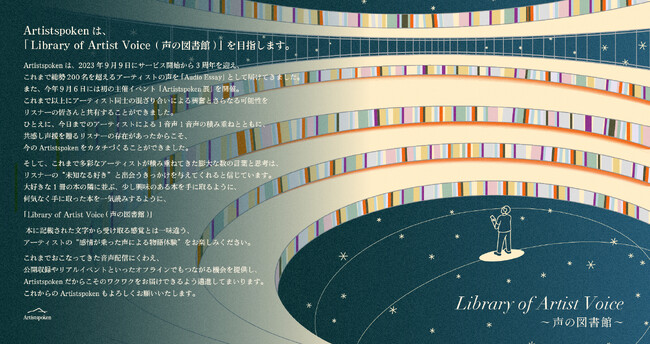 2020年9月9日にスタートした「Artistspoken」( https://artistspoken.com/lp/ )は、サービス開始から3周年を迎えました。お笑い芸人・映画監督・建築家・ミュージシャンなど、これまでに55ジャンル・200名を超える表現者とともに、計6,500本以上のオリジナル音声を配信してまいりました。2023年9月6日には、Artistspoken参加アーティストのクロスオーバーによる主催イベント「Artistspoken展」を開催、10組のアーティストによる「公開収録」「漫才」「歌」「クロストーク」とArtistspokenだからこそ創り出せる”予測不能な混ざり合い”を体現したイベントとなり、今後さらなる”越境の可能性”を感じる機会となりました。Artistspokenは、より一層アーティストの思考・言葉を通じて、”未知なる好き”との出会いをお届けすべく、これからのArtistspokenは「Library of Artist Voice(声の図書館)」を目指します。