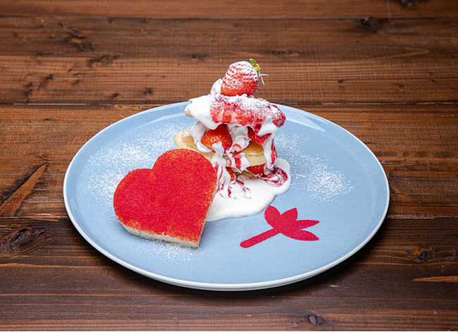 HAPPY SWINGロゴでおなじみの “ハッピーリーフ”をフランボワーズのパウダーで表現。We(ハート)Happy Swingライブロゴとお揃いの真っ赤なハートや、イチゴやホイップクリームをトッピングしたパンケーキプレートです。
