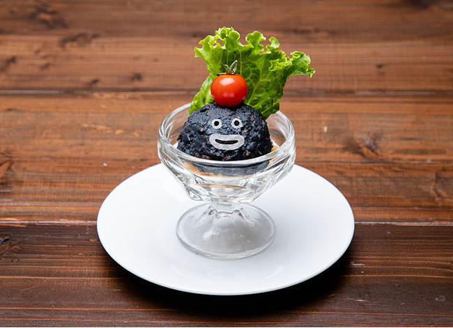黒色の正体は、竹炭とブラックオリーブ! オリーブとベーコンチップで大人な味付けのポテトサラダです。顔ももちろん食べられます!