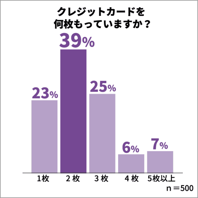 クレジットカードの保有枚数は、「2枚」が39%、「3枚」が25%、「4枚」が6%、「5枚」が7%と7割以上の方がクレジットカードを複数枚持っている結果となりました。