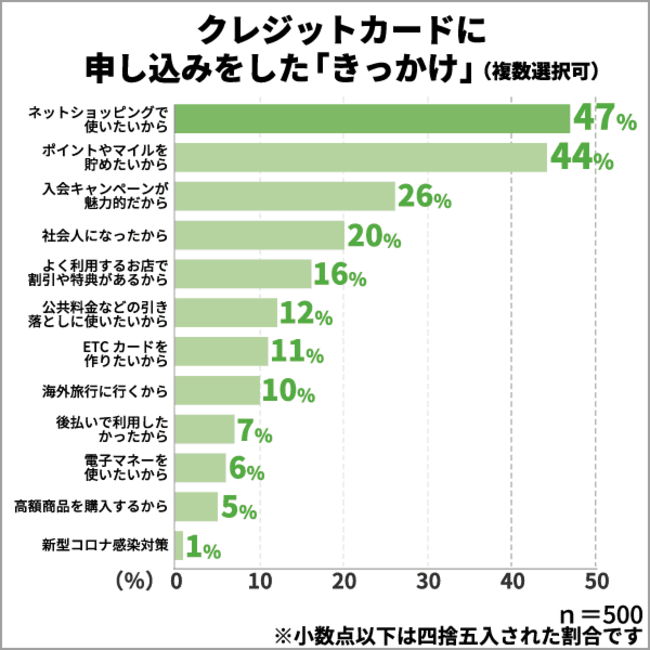 クレジットカードに申し込みをした「きっかけ」で一番多かったのは「ネットショッピングで使いたいから」という回答でした。