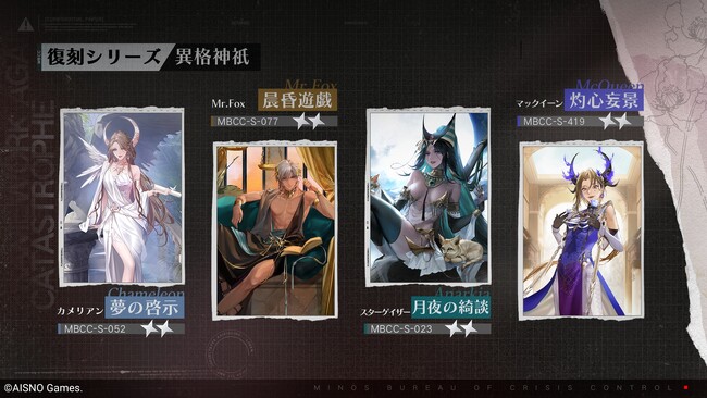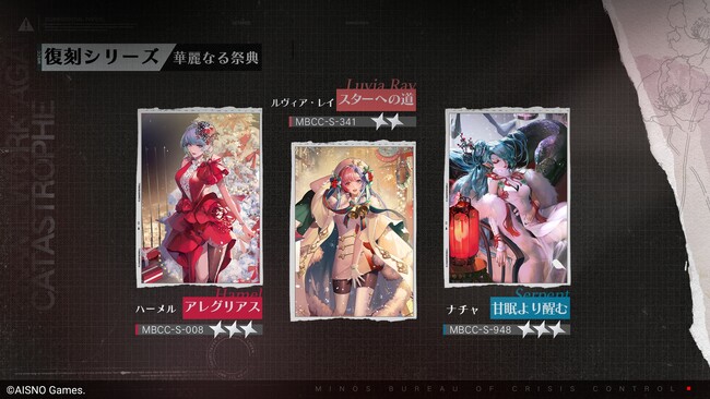 ■イベント参加方法:「ホーム画面」-「イベント」-「刻む刹那」の順にタップし、「MBCC年間業務報告」をタップするとイベントにご参加いただけます。また、直接 https://ptn.aisnogames.com/operation/report-jp.html をタップしてイベントに参加することも可能です。