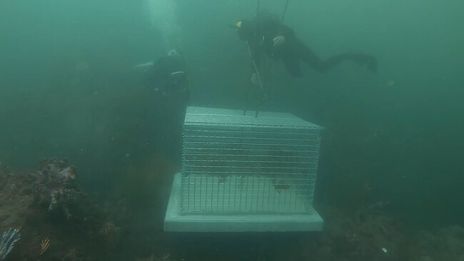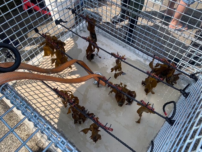 早熟カジメ(通常よりも成熟の早いカジメ)を、食害生物による被害を受けにくい保護網付きの藻場礁に入れ、海底に設置。