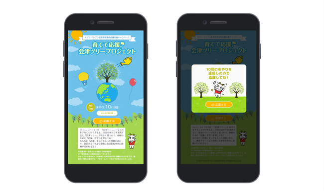 福島県会津若松市内のセブン‐イレブン店舗にて「スマートレシート(R)」を利用してお買い物をすると、削減した1レシートにつき1口を獲得できます。獲得した口数分「スマートレシート(R)」アプリ内キャンペーンページ内に表示される「会津ツリー」に水やりをすることでツリーが育ち、10回の水やりでツリーの成長を達成するごとに1回、「応援」ボタンを押すことができる仕組みです。