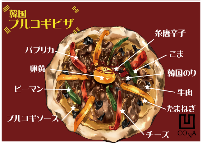 『韓国プルコギピザ』はプルコギの甘辛い味付けをした牛肉と野菜のピザ。『シーフードピザ』はケイジャンスパイスの味付けをした海鮮が乗っかっており少しスパイシーなピザとなっております。双方のピザどちらも見た目も味もダイナミックなピザとなっております。またこちらはライセンス店でも同時販売を行いますので全国のCONAで楽しめるピザとなっております。