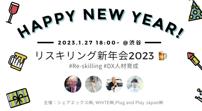 「MENTERなど文系DX人材育成サービスを提供するWHITE株式会社(本社:神奈川県横浜市、代表取締役:横山 隆、以下 当社)、「DXインターン」をはじめリスキリングサービスを提供するシェアエックス株式会社、世界最大級のアクセラレーター/VCであるPlug and Play Japanの3社がリスキリング新年会2023を共同開催します。