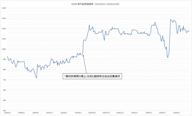 買収防衛策を廃止した方が企業価値向上に資するというのが株式市場の評価であることは既に実証されています。すなわち、当社が「買収防衛策の廃止」の議案を含む臨時株主総会の招集請求をした事実が昨年9月11日午後8時30分ころに乾汽船により開示されました。すると、翌12日に株価が跳ね上がりました。9月11日までは900円台(終値は976円)であったのが、12日は寄付き前の時点で1000円を超え、12日の始値は1029円でした。当時の株価チャートを見ると、9月11日と9月12日の間で線が飛んでおり、つながっておらず、いかに株価が急騰したかが良くわかります。12日以降、株価は上昇し続け、9月25日には1200円を超えるに至りました。他方、昨年10月7日午後7時ころに、乾汽船が買収防衛策の廃止の議案を付議しない内容の招集通知を発送する旨を開示したところ、翌10月8日は日経225もTOPIXも上昇しているにもかかわらず、乾汽船の株価は約2.3%も下落しました。この株価の動きから理解される株式市場の合理的意思は、買収防衛策を廃止した方が企業価値向上に資するというものです