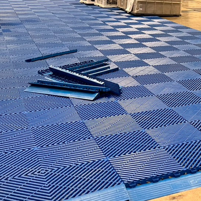 床面はパンチカーペットを使わず再利用可能な樹脂パネルを使用しています。