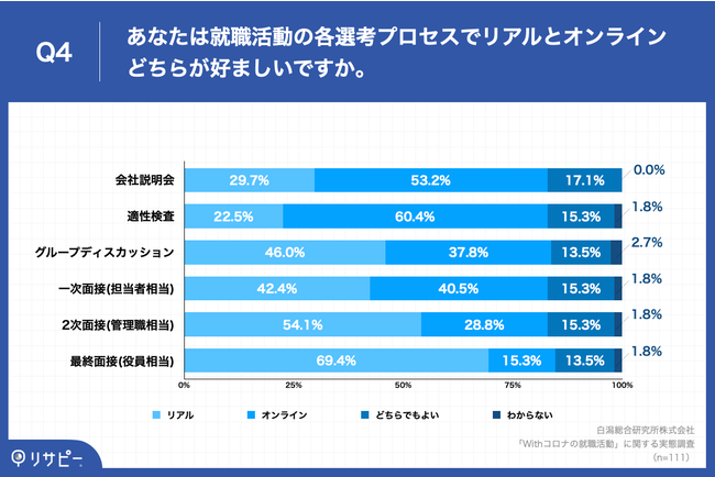 「Q4.あなたは就職活動の各選考プロセスでリアルとオンラインどちらが好ましいですか。」(n=111)と質問したところ、「最終面接(役員相当):リアル」が69.4%、「適性検査:オンライン」が60.4%という回答となりました。