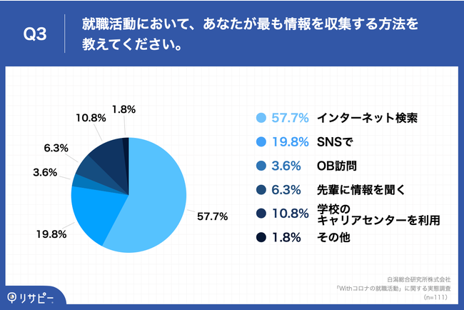 「Q3.就職活動において、あなたが最も情報を収集する方法を教えてください。」(n=111)と質問したところ、「インターネット検索」が57.7%、「SNSで」が19.8%という回答となりました。