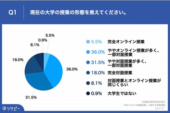 「Q1.現在の大学の授業の形態を教えてください。」(n=111)と質問したところ、「完全オンライン授業」が5.5%、「ややオンライン授業が多く、一部対面授業」が36.0%という回答となりました。