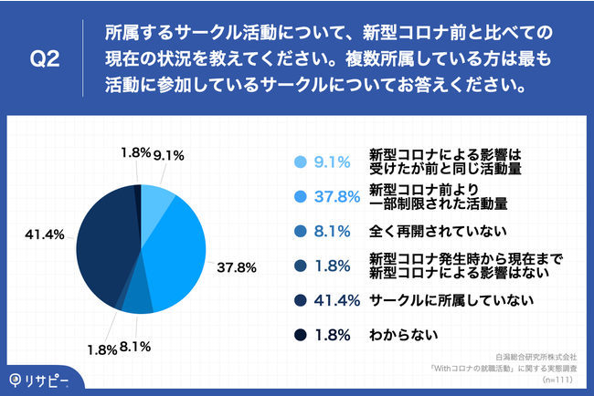 「Q2.所属するサークル活動について、新型コロナ前と比べての現在の状況を教えてください。複数所属している方は最も活動に参加しているサークルについてお答えください。」(n=111)と質問したところ、「新型コロナ前より一部制限された活動量」が37.8%、という回答となりました。