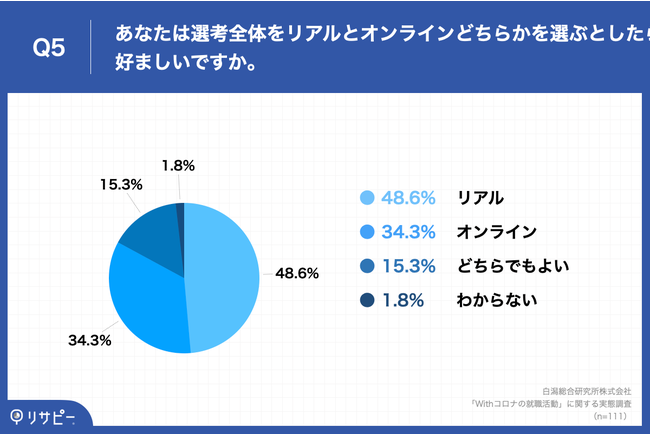 「Q5.あなたは選考全体をリアルとオンラインどちらかを選ぶとしたら、どちらか好ましいですか。」(n=111)と質問したところ、「リアル」が48.6%、「オンライン」が34.3%という回答となりました。