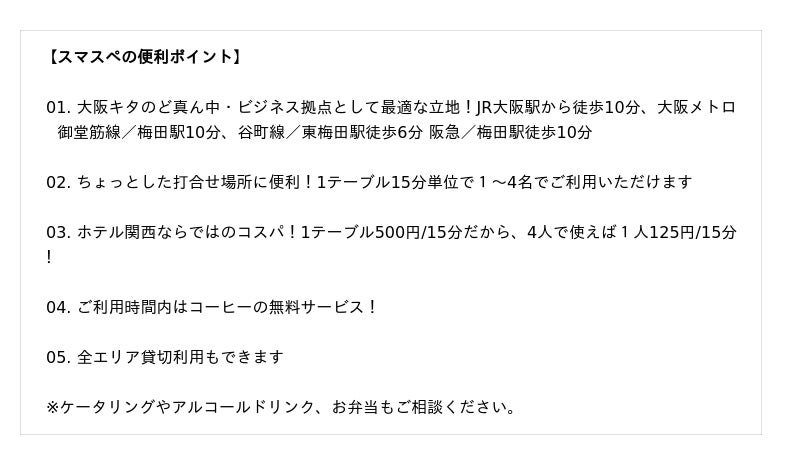 「Smart Space KANSAI スマート・スペース・カンサイ (スマスぺ)」は、 ホテル関西1階にございます。 宿泊の方はもちろん、 宿泊されない方もご利用可能です。 JR大阪駅から徒歩約10分という利便性と、ちょっとした打合せができるミーティングスペースやセミナールームなど、 さまざまな用途に合ったご使用ができます。