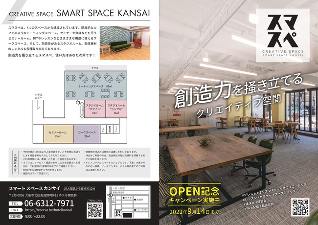 JR大阪駅より徒歩10分の便利なホテル、 ホテル関西(所在地:大阪府大阪市北区兎我野町9-15)が館内リニューアルを行いました。そして、 7月15日よりホテル関西内にコワーキングスペース「Smart Space KANSAI スマート・スペース・カンサイ(スマスぺ)」をプレオープンしました。プレオープン記念キャンペーン中、打合せスペースが250円/15分(1テーブル) と通常価格の半額でご使用できます。【2022/9/14(水)まで】