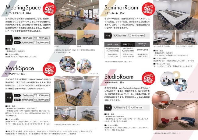 ホテル関西宿泊のお客さまには、プレオープン記念で、ミーティングスペースを30分無料で利用できるプランもございます。チェックイン時にご利用時間をお伝え下さい。