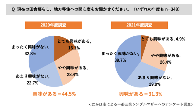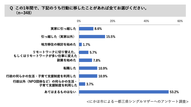 秋田県にかほ市による一都三県シングルマザー調査:この1年間でおよそ4人に1人が引っ越しを実施、コロナ禍で仕事での変化も 地方移住への興味は3割強