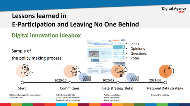 デジタル庁が国連で行ったGlobal E-Participation Workshopの資料に、弊社のアイデアボックスが日本政府において、10年以上の実績があり、市民参加の重要な役割を果たしたことが紹介されました。