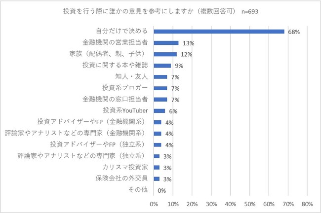 投資を行う際の意思決定はどのように行っているのでしょうか。「投資を行う際に誰かの意見を参考にしますか」と質問したところ、「自分だけで決める」との回答が68パーセントと圧倒的多数を占めました。2位以下は「金融機関の営業担当者」(13パーセント)、「家族(配偶者、親、子供)」(12パーセント)、「投資に関する本や雑誌」(9パーセント)が続きました。