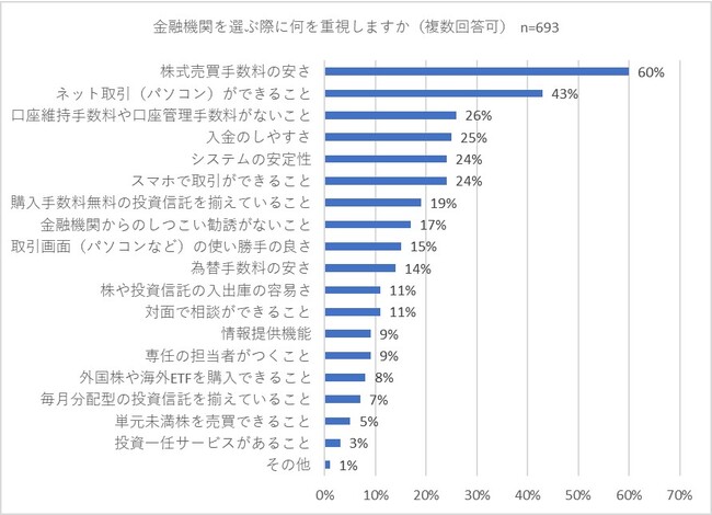 「金融機関を選ぶ際に何を重視しますか」との問いには「株式売買手数料の安さ」が60パーセントで2位以下を大きく引き離しトップとなりました。2位には「ネット取引(パソコン)ができること」(43パーセント)が入り、3位から6位までにはほぼ同じ割合で「口座維持手数料や口座管理手数料がないこと」(26パーセント)、「入金のしやすさ」(25パーセント)、「システムの安定性」(24パーセント)、「スマホで取引ができること」(24パーセント)が続きました。
