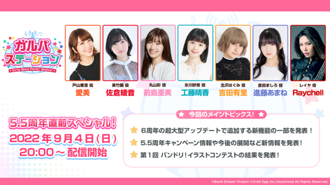 株式会社Craft Egg(本社:東京都渋谷区 代表取締役:森川 修一、以下、Craft Egg)と、株式会社ブシロード(本社:東京都中野区 代表取締役社長:木谷 高明、以下、ブシロード)の共同制作によるスマートフォン向けゲーム「バンドリ! ガールズバンドパーティ!」(以下、ガルパ)は、9月4日(日)20時より配信の「ガルパステーション 5.5周年直前スペシャル!」にて、5.5周年キャンペーン情報を発表いたします。また、6周年に行う超大型アップデートで追加する新機能の一部や、第1回 バンドリ!イラストコンテストの結果なども発表いたします。他にも様々な新情報をお届けいたしますので、ぜひご覧ください。