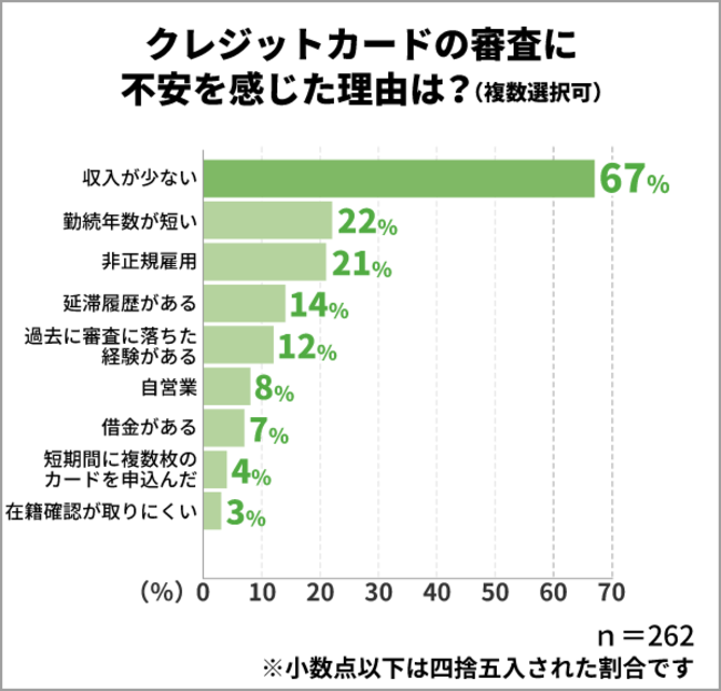 「非正規雇用」などの安定した収入面での理由以外にも「審査が厳しい上級カードに申し込みした」という理由を回答した方が1割を超えています。