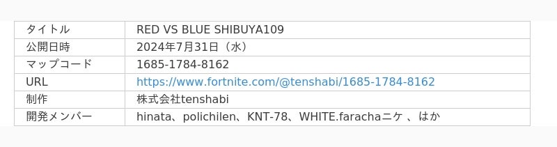 株式会社tenshabi(本社:千葉県松戸市、代表取締役:溝口 新平/以下、tenshabi)は、株式会社SHIBUYA109エンタテイメント(本社:東京都渋谷区、代表取締役社長:石川 あゆみ/以下、SHIBUYA109エンタテイメント)とのコラボレーションで、全世界5億人以上のユーザーを誇る世界的人気ゲーム「Fortnite」 にて、2つのチームに分かれて対戦を行うオリジナルゲームマップ「RED VS BLUE SHIBUYA109」を、2024年7月31日(水)にリリースいたしました。