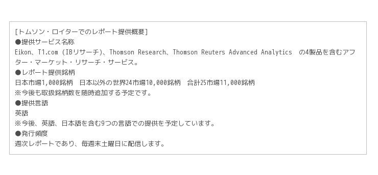 当社BtoB向けサービスの世界展開の第一弾として、世界中の金融機関、事業法人をはじめとする専門家の皆様をクライアントに有する世界最大級の情報ベンダー、トムソン・ロイター社が提供する各種サービスを配信基盤として、本レポートを世界配信いたします。今後、カバレッジ銘柄の拡大とともに、配信ルートの拡張およびレポートの多様化を進めます。