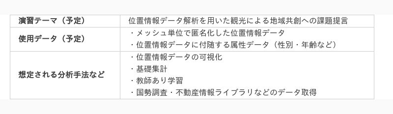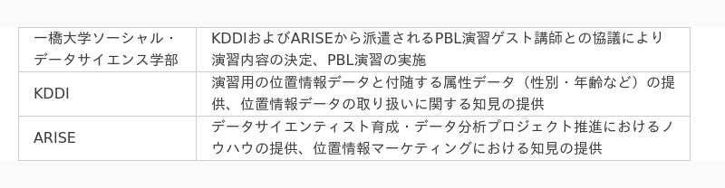 一橋大学において、ソーシャル・データサイエンス学部の開設に際し、企業・官庁へのPBL演習担当の募集が行われ、位置情報データの分析・活用に強みを持つKDDIとARISEが応募しました。KDDIとARISEは、両社のアセットを生かした社会貢献活動の一環として、社会課題解決に導くデータサイエンス人材の育成・輩出を目指し、連携・協力しています。