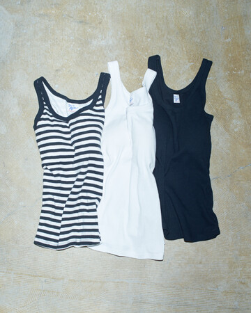 〈Robert P. Miller〉特有のパネルリブ生地を活かしてフロントや脇の開き、ストラップの長さなど細部までこだわり、女性がヘルシーに着られる一枚。カップ付きなのでインナーを気にせず一枚でさらっと夏の着こなしを楽しめます。特にメルローズ別注のボーダー生地は、大人が着やすいミドルピッチで少しモードな雰囲気に。